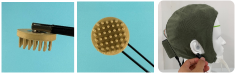 2. 微针阵列电极/脑电采集帽:实现在人体毛发部位的贴合度与信号传输效率,为精准医疗监测提供了强有力的支持,柔性硅胶基底,具有良好的电性能和柔性,实现皮肤表面的长时间、无创监测。开发的脑电采集帽具有良好的电性能和柔性,可抗毛发干扰,用于脑电信号的实时采集和分析,实现多通道活动状态的实时监测,有线/WLAN数据无线传输。