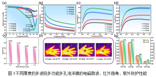 多波段兼容性:当膜的厚度为1.2 mm时,功能粒子含量为20 wt%,碳纤维粉粒径为1500目多波段多功能多孔泡沫膜的反射损耗在16.1 GHz时达到-15.86 dB,可以吸收96%以上的电磁微波,有效带宽3.4 GHz(覆盖常用雷达波段);红外发射率低至0.598,温差ΔT仅1.6℃,显著降低热成像识别率;紫外防护:日光紫外线UVA透过率为0.01%,日光紫外线UVB透过率为0.02%,UPF值为1866,可以吸收99%以上的紫外线。