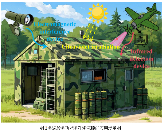 多波段多功能多孔泡沫膜独特的性能组合(电磁波吸收、红外隐身、紫外防护、吸声降噪、保温隔热、抗渗水、耐老化)使其主要应用于军事基地、指挥所、弹药库等军事设施的伪装覆盖层,具备多重功能:其一,能够有效吸收内部电子设备产生的电磁信号,防止敌方电子侦察系统的探测。其二,在红外波段能够实现与周围环境的热辐射融合,避免被红外热成像设备识别。其三,能够抵御外界紫外辐射对设施内物资及设备的损害,从而显著提升军事设施的隐蔽性与安全性。